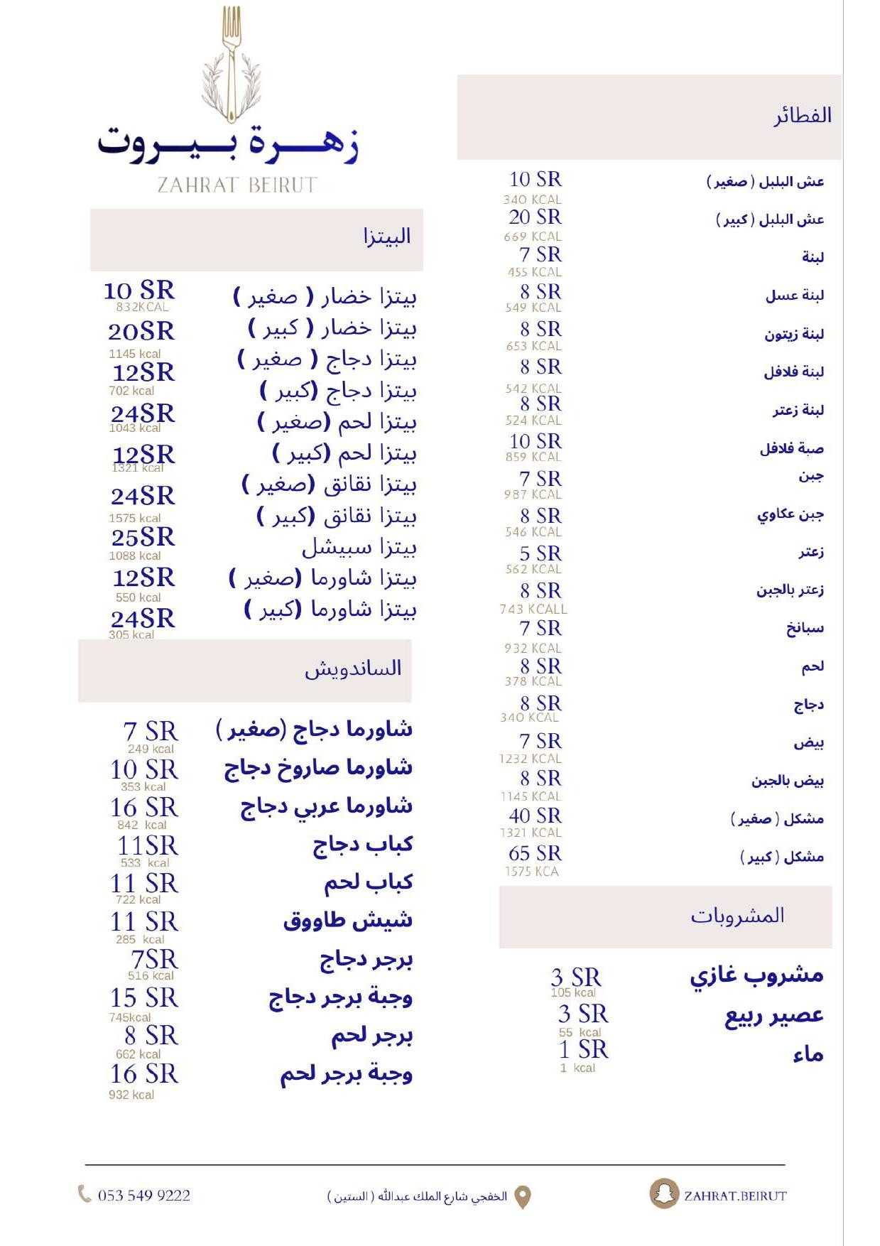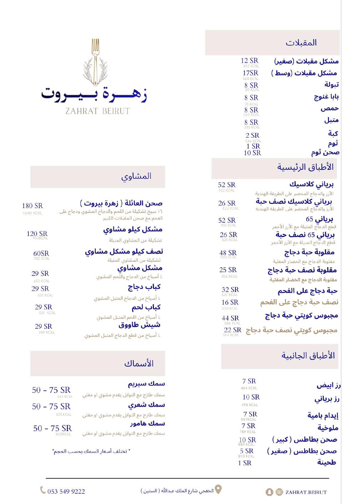 حياكم الله في مطعم زهرة بيروت منتجاتنا نوفر أشهى الأطباق منالمشويات – أسماكرز – مقبلات – فطائربيتزا – همبرجر الشاورما وجبة الغداء مقلوبة الدجاج ومكبوسة الدجاج وبريانيودجاج على الفحم مع الأرز زورنا واستمتع الخفجي شارع الملك عبد الله (شارع الستين)